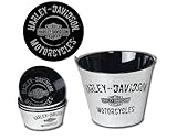 Enjoy your favorite snacks in this H-D® Motorcycles Bucket Snack Set. High contrast between the galvanized metal surface and gloss black inside gives a pure Harley® feel. All pieces feature distressed H-D Motorcycles graphics on both the inner and outer surfaces to complete the look. Dimensions: Bucket: 9" diameter X 7"(H) 22.86 cm x 17.78 cm. Snack Tins: 5.5" diameter X 2.5"(H) 13.97 cm x 6.35 cm.