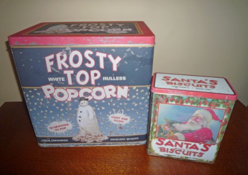 Vintage Advertising Food Canister Tins 2pc Set - Frosty Top Popcorn, Santa's Biscuits Specification